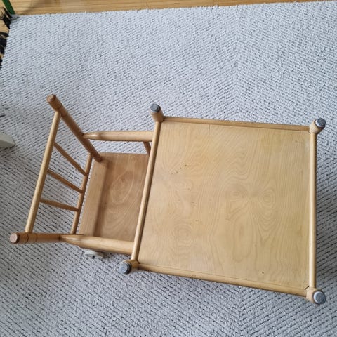 Syöttötuoli muuntuu käännettäessä pöydäksi sekä ratti ja istuinosaksi tietysti käytönjälkiä on mutta tukeva ja hyvä