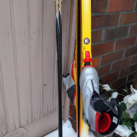 Tosi hyvää kuntoa. Sukset 185 cm, sauvat 150 cm, monot koko 41, kaksi pidikettä ja erinomaisen laadukas säilytyslaukku.