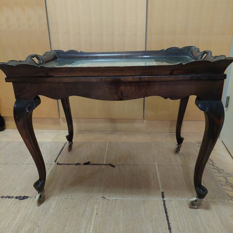 Pöytä on tukeva ja hyväkuntoinen ikäisekseen, pientä patinaa.
