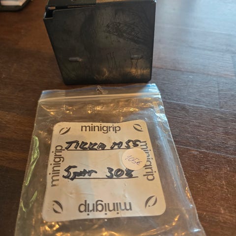 Hieman lyhennetty m55 tikka vaimentimella. Hyvä kuntoinen, kevyt tarkka kanalintu jahtiin soveltuva ase. Tai nuorelle vaikka peura aseeksi. Mukava ammuttava, rekyyli lähes 0. Mukaan Leen latausholkit ja paukkuja 22kpl 6,5g Norman oryx, sekä 39kpl Norman 6,2g FMJ, kymmenisen sakon 5,8g FMJ kymmenisen Lapua 5,8g FMJ. Sekä läjä hylsyjä. Sekä "purettavaksi" 5,5g scenar, 3,6g varmageddom, 5,5g soft point paukkuja kymmeniä.