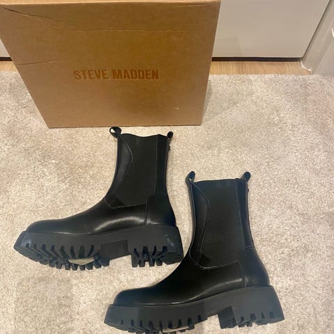 Myyntiin hyväkuntoiset Steve Maddenin ” Barney Ankleboot ” nahkasaappaat koossa 36. Olleet vähällä käytöllä, mainittavaa vain kiviä pohjassa, saanee poistettua. Saappaissa on sivulla vetoketju ja niitti koristeet edessä ja takana. Ostettu aikoinaan Stockmannilta.