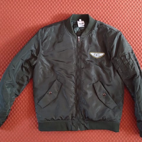 Armeijanvihreä vain pari kertaa päällä ollut bomber-takki. Kuten hihansuistakin näkee, on kuin uusi. "Kultaiset" napit ja vetoketju. (Siksi myynnissä, koska kultainen ei itselle sovi)