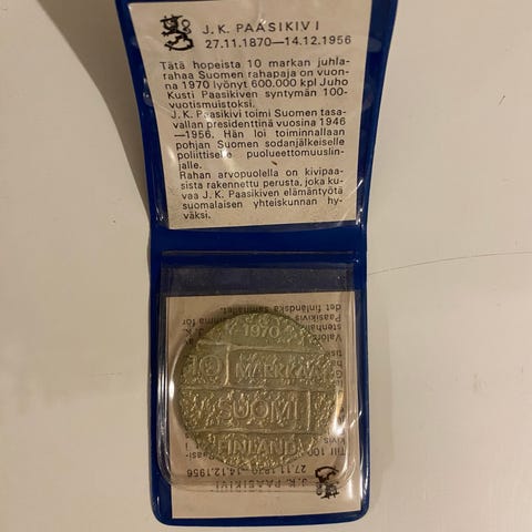 Suomi hopeinen 10 markan juhlaraha 1970, lyöty 600000 kappaletta Juho Kusti Paasikiven syntymän 100-vuotismuistoksi. Toimi Suomen rahavallan presidenttinä 1946-1956. Hän loi Pohjan Suomen sodanjälkeiselle poliittiselle puolueettomuslinjalle.