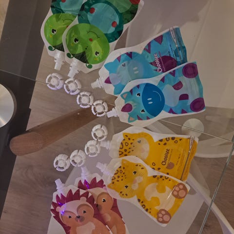 Lasten juomapussit, joissa on erilaisia eläinaiheisia kuvia kuten yksisarvinen, leopardi, perhonen ja siili. Setissä on yhteensä 8 kappaletta. Pussit ovat uudelleenkäytettäviä ja sopivat lasten juomien säilytykseen ja kuljetukseen. Olemme käyttäneet sose ruokien kuljetukseen ja syömiseen.