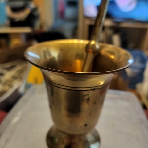 Ehjä, painava, korkeus 9 cm. Messinkiä.