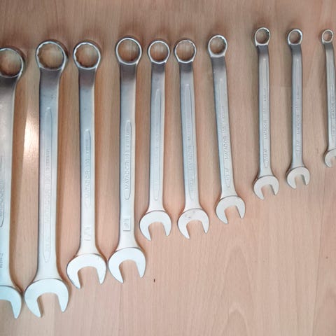 Laitoin työkalujen kunnoksi hyvä, koska niissä on naarmuja ja kolhuja, koska niitä on säilytetty työkalupakissa ja siellä ne on kosketuksessa tosiinsa, mutta avainväleistä näkee ettei niillä ole koskaan väännetty yhtään mitään.