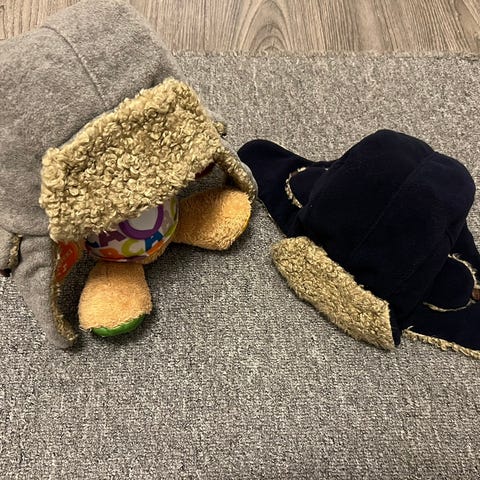 Hatun materiaalit oliivinvihreää 100% puuvillaa (canvasta) ja tekoturkista. Sisäosa mustaa tilattua puuvillakangasta. Narut sitomista varten.
