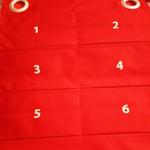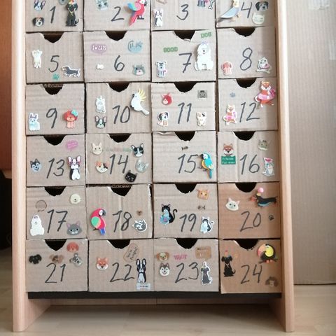 Itse tehty, seinälle ripustettava joulukalenteri. 24 numeroitua farkkujen taskua, joihin voit piilottaa kalenterillätyksiä. Koko on n. 62 cm x 140 cm.