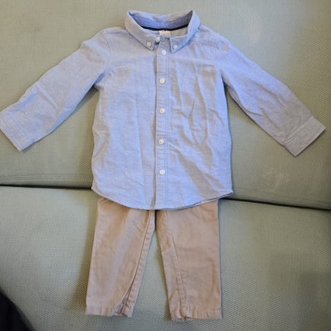 Kerran päällä ollut valkoinen kauluspaita ja tummansiniset housut. Housuissa vyötäröllä säätömahdollisuus. Mukaan tulee myös henkselit ja rusetti. Menee myös koossa 92.
