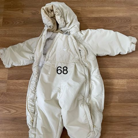 Umpinainen jalkaterä. Resorit hihoissa. Huppu kiinni neppareilla. Selässä kuminauha, ja tarrakiristysmahdollisuus. Ja ihana sydän takapuolessa.