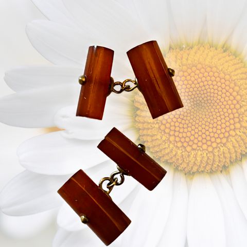 Hyväkuntoiset kalvosinnapit, joissa ehjät meripihkakivet. Kalvosinnapit on mielestäni kullattu. Alla olevasta metallista ei ole tietoa. Kalvosimet on leimattu. Leima näkyy kolmannessa kuvassa (SRK) Kalvosinnappien pituus on 2,1 cm. Yksi kalvosinnappi painaa 3,8 g. Molempien paino yhteensä on 7,6 g.