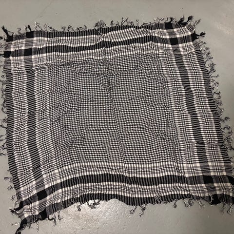 Pehmeää puuvillaa oleva mustavalkoinen iso huivi, neliönmuotoinen.