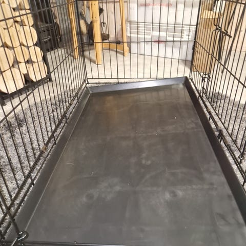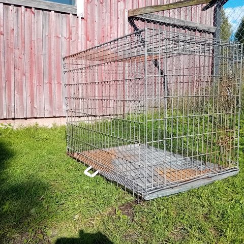Iso ja tukeva kuljetushäkki. Kaksi ovea edessä. Kuvan juomakipon saa mukaan. Voin auttaa kyytiin nostamisessa. Häkki on painava.