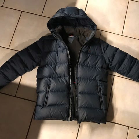Lämmin untuvatakki. Sisäpuolella isot taskut. Irroitettava huppu. Pääosin siisti, mutta valkoisessa hihassa pinttynyttä likaa.