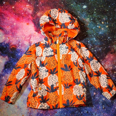 Peuhu tumma maastokuvioinen kevyttoppatakki koko 100. Pienet heijastimet oikeassa olkapäässä sekä vetoketjutaskujen vetiminä edessä.