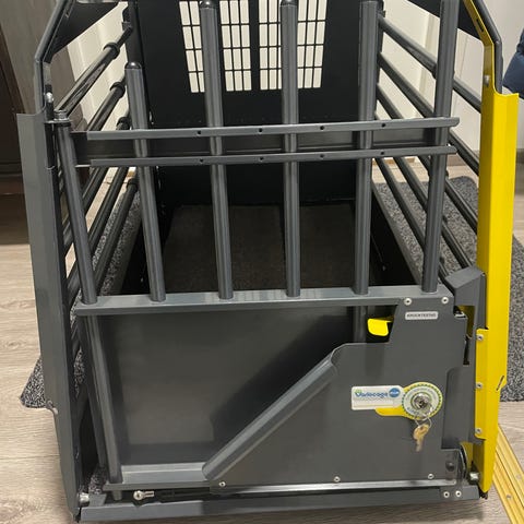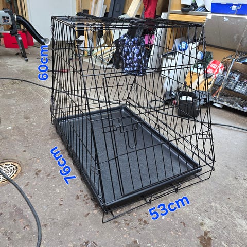 Metallinen koirankuljetushäkki.
