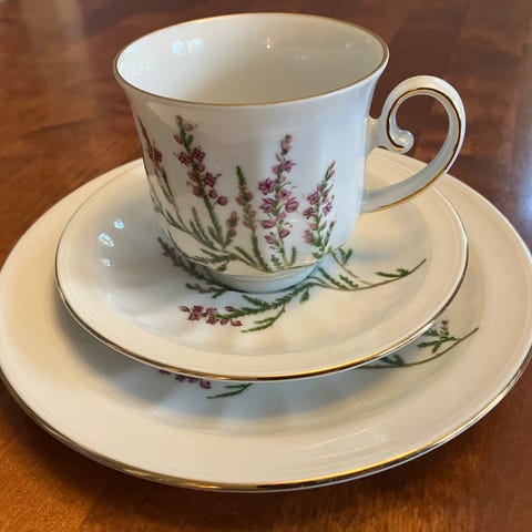 Fyrklövern / Apilanlehti 2 kahvikuppia tasseineen, leipälautaset mukana. Keräilysarja, jossa aiheina erilaiset luonnonvaraiset kukat, näistä 2 kuppia ”Anermone Nemorosa” ja ”Primula Veris”. Kuvissa näkyvä kolmas lintuaiheinen kuppisetti on myyty eikä enää saatavilla.