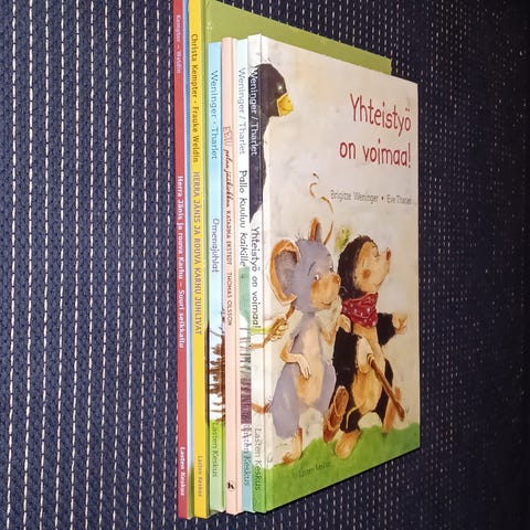 Neljä lasten kirjaa. Kirjat hyväkuntoisia. Koululaisen pikkujättiläistä luettu eniten, joka näkyy muutamalla ensimmäisellä aukeamalla (kuvassa).