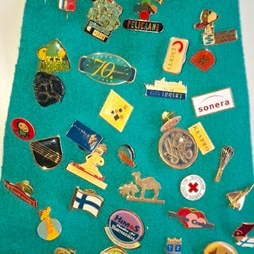 Sekalainen kokoelma rintaneuloja ja pinssejä eri aiheista ja väreistä