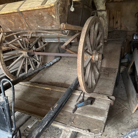 Kärry, kylvökone ja jonkinmoiset kiesit. Olleet ladossa suojassa vuosikymmeniä, ovat aika kulahtaneita kaikki, mutta eivät lahoja.