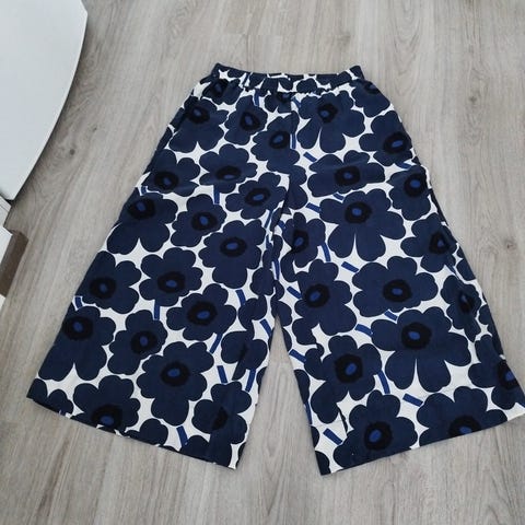 Marimekko kohti perenna housut naisille, koko L. Housuissa on kirjava kukkakuviointi. Housujen pituus 109cm. Lahkeiden leveys 45cm.
