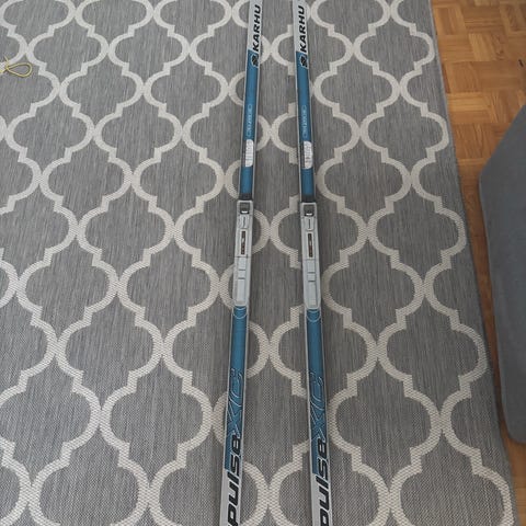 Karhu hiihtosukset sauvoilla, väri sininen. Setti sisältää parin suksia ja sauvat. Sukset on varustettu sidonnoilla. Sopii talviurheiluun ja hiihtoharrastukseen.