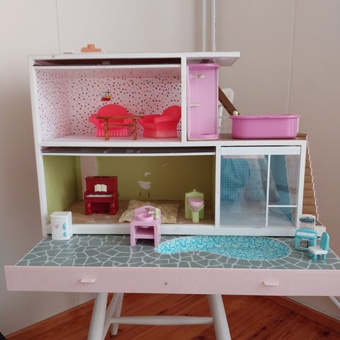 Lundby merkkinen nukkekoti myyntiin. Mukana saa kuvassa näkyvät tavarat. Nukkekodissa on se peruskerros ja extrana kellarikerros jonka saa irti eli yhteensä kolme kerrosta. Siinä on toimivat valot. Mukana saa loput palat niihin valoihin. Seinissä näkyy valkoisia jälkiä tarroista ja lattiassa on muutamia tummentumia (joita ei toki huomaa!). Kalusteet ovat uudenveroisessa kunnossa. Nukkekodin korkeus (korkeimmasta kohdasta) on 60 cm. Leveys on 66 cm. Syvyys on 25cm. Vain nouto Lappeenrannasta