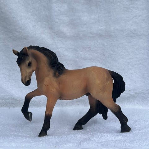 Tämä tässä on Schleich 13666 Lusitano ruuna. Pieniä kuluma jälkiä löytyy ja toinen korva puuttuu. Kunto näkyy kuvissa. 😊