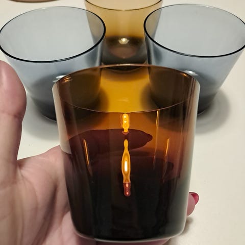 Nuutajärven lasi - Kaj Franckin suunnittelemat lasiset kartion muotoiset juomalasit monivärisinä.