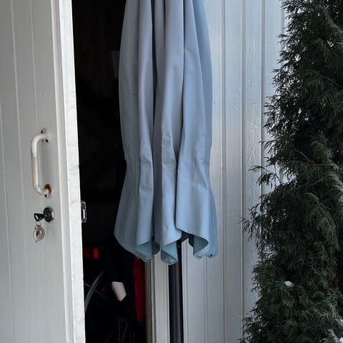 2m halkaisija, valkoinen väri, taivutettava ja säädettävä jalka piikkijalalla.