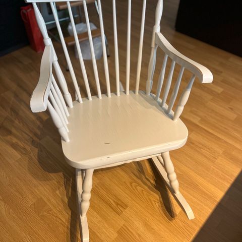 Valkoinen keinutuoli valmistettu puusta. Tuolissa on selkänojan pystysuorat tukipalkit ja käsinojat. Sopii kodin tai muun tilan istuinratkaisuksi.
