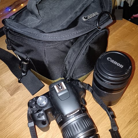 Moitteeton kunto täyskennokamera. Muistikortti ja akku.
