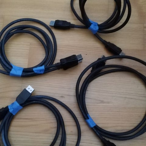 Tietokonejohtoja. 3kpl VGA johtoa, 1kpl rj45 johto ja Hardlock LT laitteistolukko (dongle)