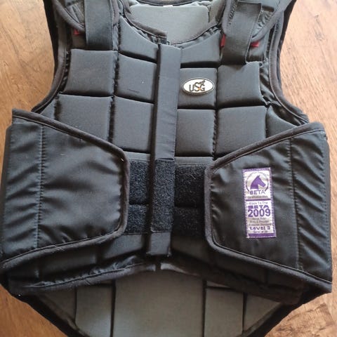 USG suojaliivi mustassa värissä. Liivissä on edessä vetoketju ja tarrakiinnitys. Sopii suojaamaan vartaloa ratsastuksen tai muun aktiivisen toiminnan aikana. Koko 3xs, sopii noin 140cm (+/-10cm) ratsastajalle.