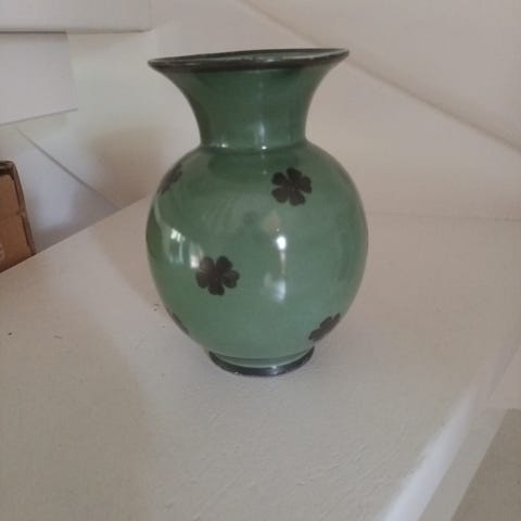 Saksalainen? Luultavasti. Korkeus 20 cm, pohja 9 cm, yläreunan halkaisija 12,5 cm, mutta kukille 4-5 cm aukko ylhäällä, eli kauniisti kimppuun asettuvat esille.