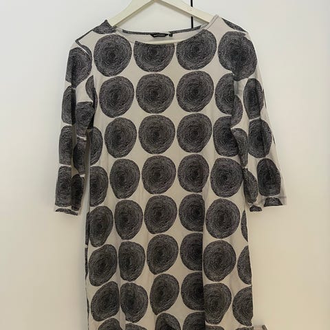 Marimekon Pirskeri pinkki/fuksia mekko, taskullinen. Koko M, mitat kai-kai 51 cm ja olka-helma 92 cm. Melko reilua kokoa. Materiaali viskoosi/villa+ elastaani eli joustaa myös, paksuhkoa kangasta.