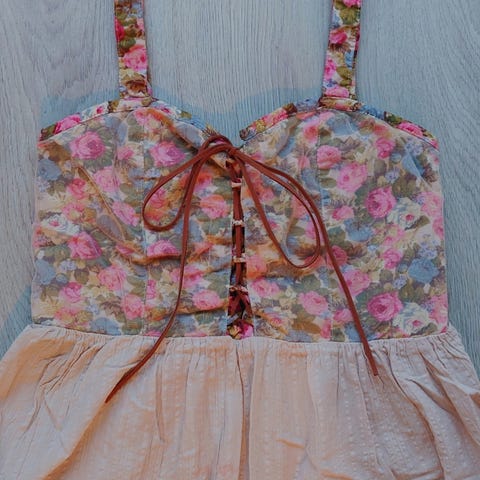 Japanilaisen gyaru merkki Riendan kukallinen bandeaumekko. Pussittavan mallinen ylä- ja alaosa. Menee XS-M kokoiselle. Erittäin hyvässä kunnossa.