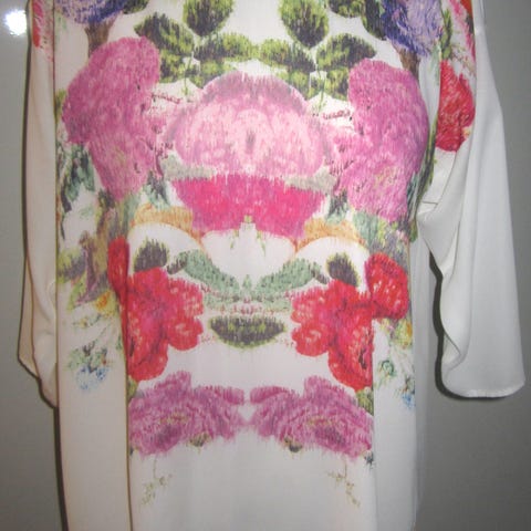 V-aukkoinen, perhoshihainen pusero. Mukavaa kevyttä ja viileää materiaalia, ei rypisty helposti. Koko sopii hyvin S-M koolle.