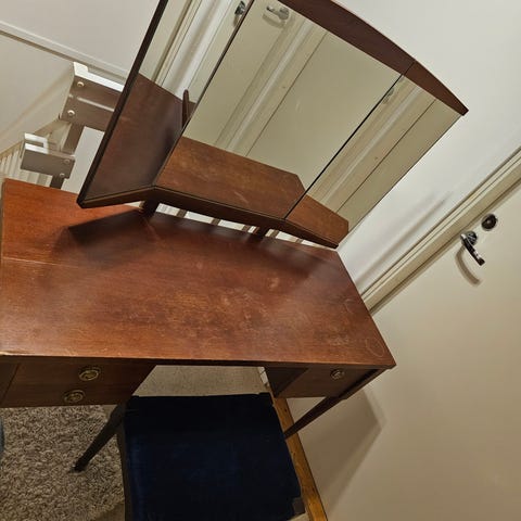 Kivan näköinen meikkipöytä, pöydässä on pieniä käytön jälkiä, muuten hyväkuntoinen.