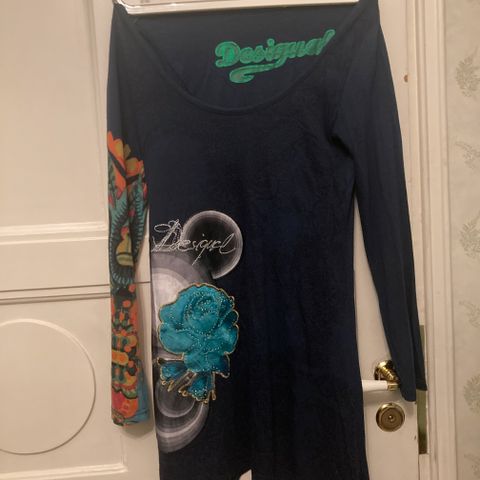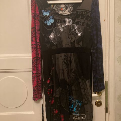 Desigual naisten mekko/tunika, väriltään beige. Mekossa on lyhyet hihat ja kaulus, ja se on valmistettu pehmeästä materiaalista. Koko on One size, ja mekossa on kuvioitu design, jossa näkyy ikkunoita ja ovia. Aivan ihastuttava tunika. Tekoäly antoi merkiksi Desigual, tunikasta puuttuu laput.