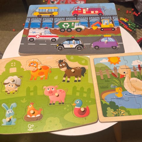 Taaperolle palapelit. Tehty ja hieman kulumaa nähtävissä joissain paloissa, mutta hyvin käyttökelpoiset mielestäni vielä. Toinen Hape -merkiltä.