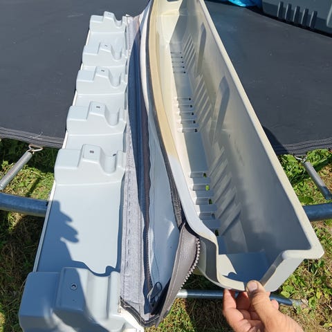 Kuvien alumiinilaatikko, kanteen liimattu mattoa. Laatikon pituus 150 x32x26. Tämä on tehty kahdesta alumiinilaatikosta hitsaamalla ne yhteen. Veneprojektiin piti tulla, veneet on myyty pois. Tästä veneeseen hyvä laatikko tavaran säilytykseen. Nouto ainoastaan pituuden takia ei kannata lähettää