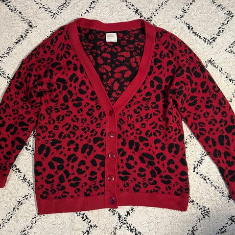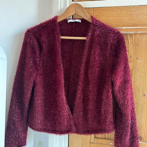Anne Linnonmaan naisellinen neulejakku. Kirkkaan punainen (väri aavistuksen himmeämpi kuin kuvissa) röyhelöreunainen jakku, reunassa piilossa kaksi nappia lenkkeineen, voi käyttää avoinna tai suljettuna.