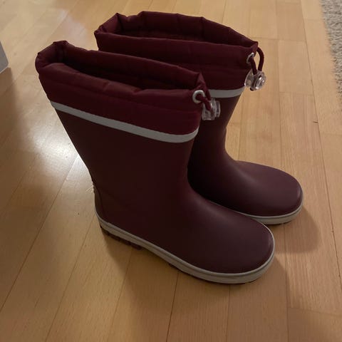 Mustat, vuorilliset kumisaappaat. Vuori 70% polyester, 30% villa. Käytön jälkiä näkyy. Kissatalous.