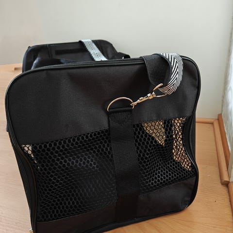 Musta harmaa koiran/kissan kuljetuslaukku. Pohjan pituus 40cm, leveys 23cm ja korkeus 23cm. Irroitettava sisäpohja. Konepesu 30 asteessa. Sisällä lukko mihin saa lemmikin kiinni valjaista tai pannasta. Ja vetoketju jolla laukun saa kiinni.