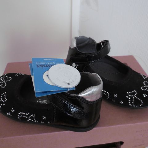 Mustat tyttöjen kiiltonahkakengät. Vera Pelle merkkiset. Timantteja kengän ympärillä. Muuten erinomaisessa kunnossa, mutta (kuva 4) pieni valkoinen kuluman jälki. Tarrakiinnityksellä