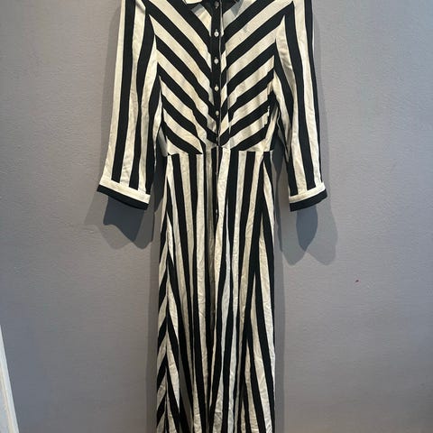 Vähän käytetty, oikein hyvässä kunnossa. Kaunis kuosi, hyvä säädettävä malli. Vyötäröllä kiristysnauha, 3/4-osa hihat, etutaskut. Käy myös tunikana talvella. Sileä materiaali ei rypisty helposti.