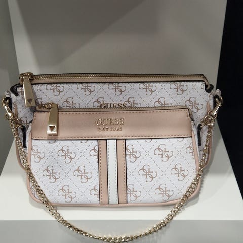 Lompakko (tila korteille, kolikoille) ja tasku puhelimelle. Etupuolella Guess-logo ja takana 3 pikkutaskua. Kullatut yksityiskohdat: logo, vetoketjut, kantohihnan kiinnikkeet. Crossbody. Kätevä esim matkoilla, mahtuu passi ja kortit/rahat sekä puhelin.
