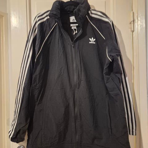 Sinini-valkoinen Adidaksen tuulitakki. Sisältä verkko muutamista kohdista revennyt.