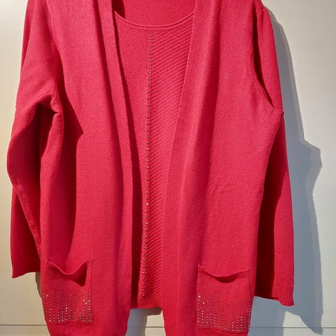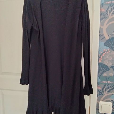 Ruskea neuletakki, pitkä. Edessä ei kiinnitysmahdollisuutta, mm. isot koristenapit edessä.